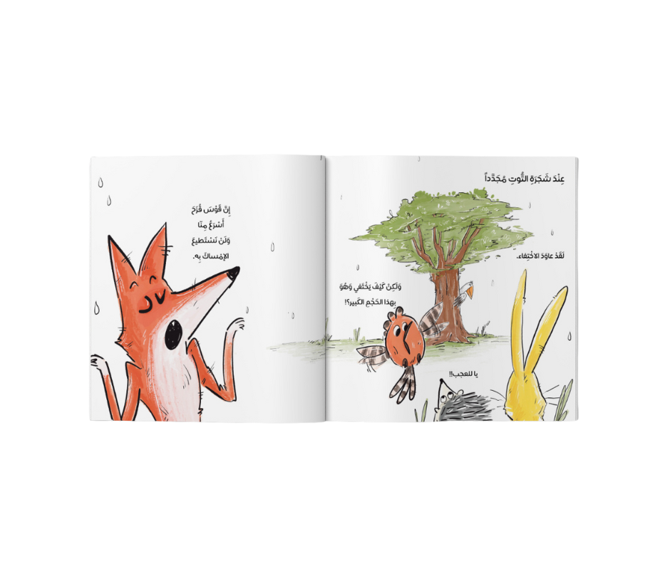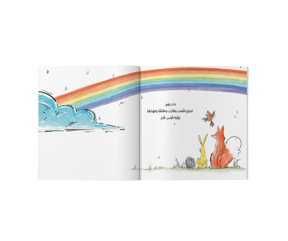 تجمّعت بعض الحيوانات، ترفع رؤوسها بدهشة، تتأمّل ألوان قوس قزح الزاهية
