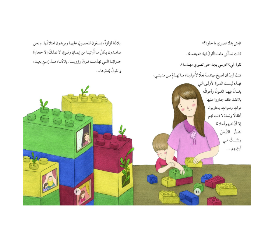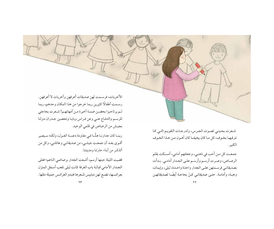هذه جدران غرزنا فيها العِلم ليحمينا وقت الحاجة؛ فلماذا يهدم الغول بأقدامه كل شيء؟ وفي وقت فراغه، يخيفنا بأنغامه المزعجة.