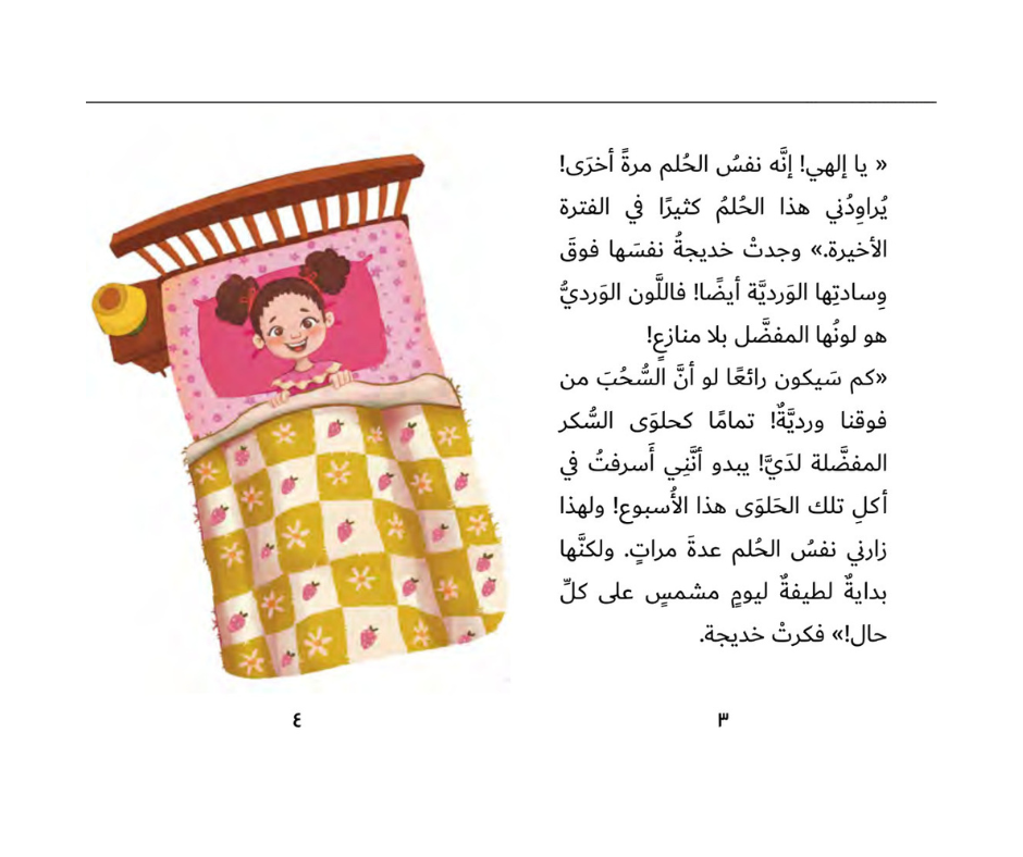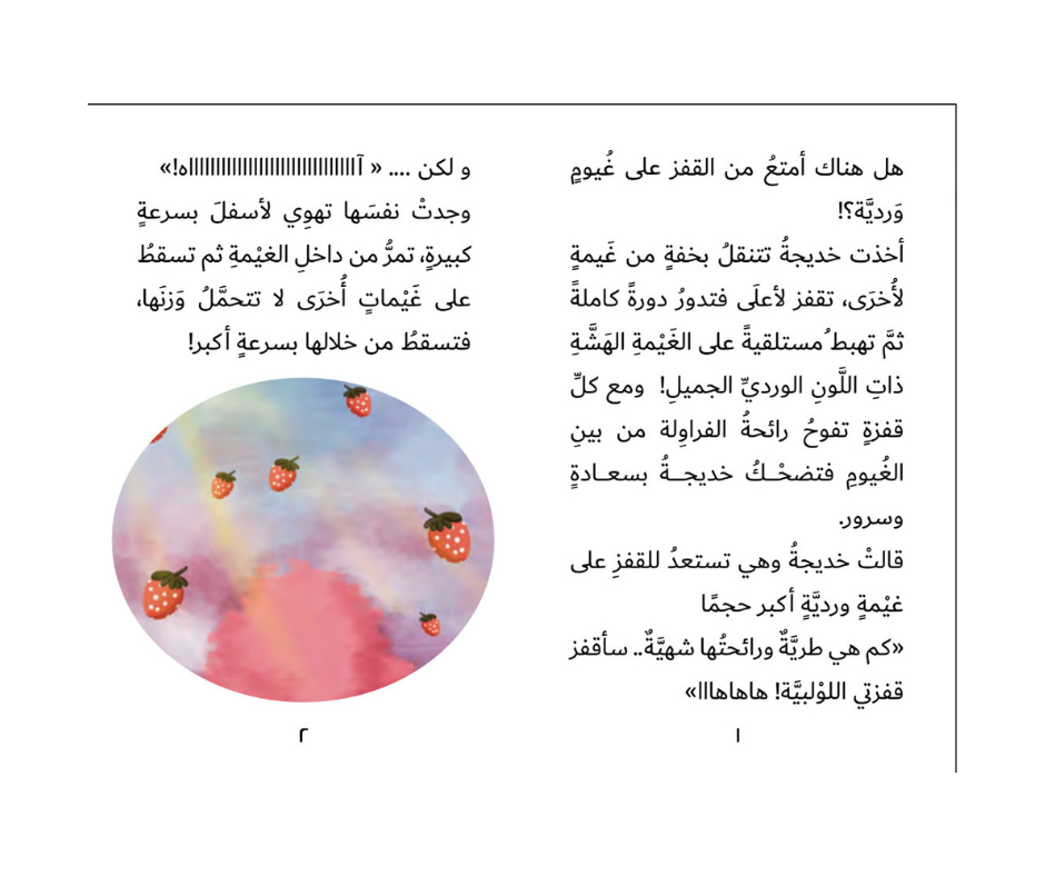 كم سَيكون رائعًا لو أنَّ السُّحُبَ من فوقنا ورديَّةٌ! تمامًا كحلوَى السُّكر المفضَّلة لدَيَّ! “حققت خديجة حلمها ببيت تظله غيوم وردية. ولكن في يوم مسابقة الفنون السنوية لم تعد الغيوم وردية…أبداً